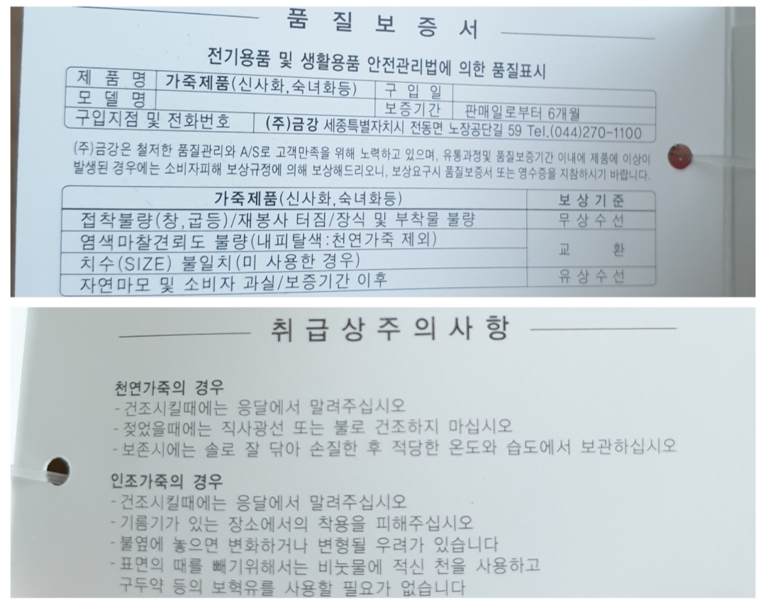 신발상자 안에는 품질보증서와 취급상주의사항이 적혀있었어요.
