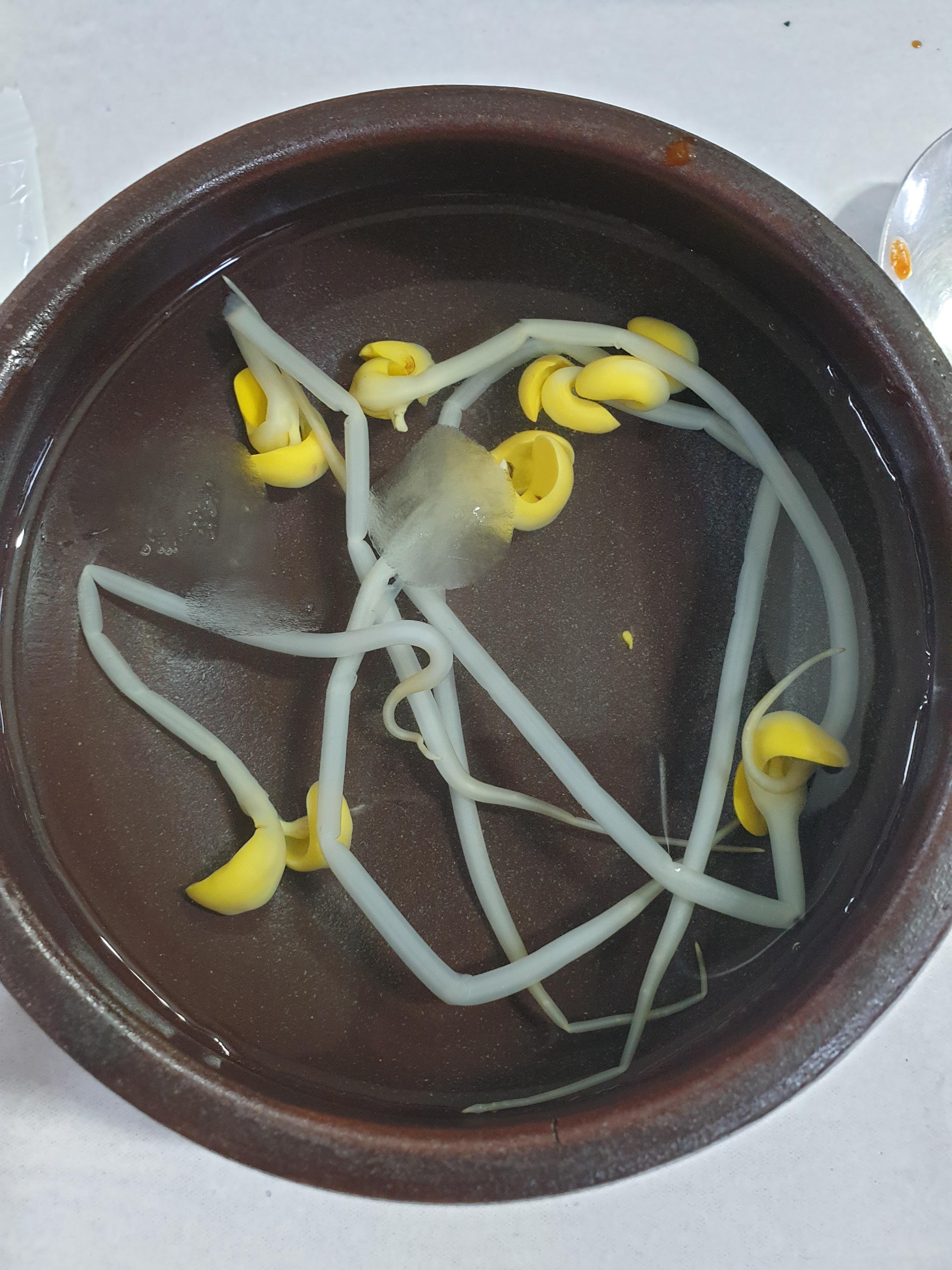 반찬으로 쌈무, 번데기, 샐러드, 시금치, 콩나물 국(1인1개)이 나왔어요.