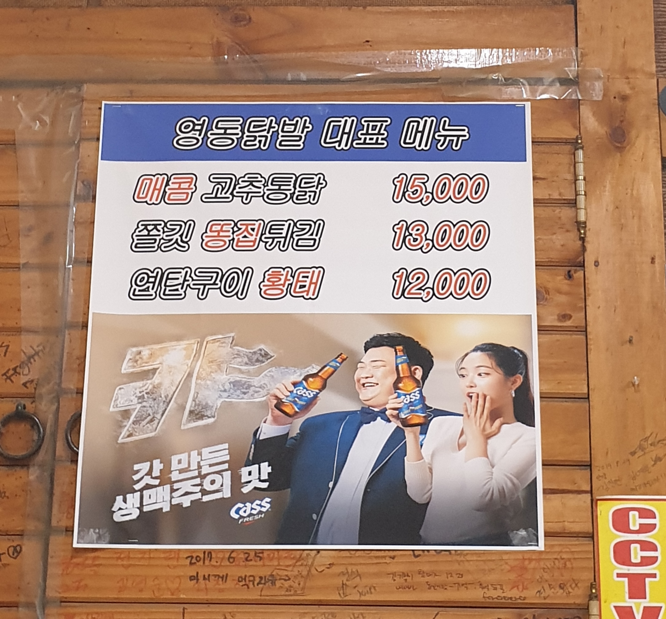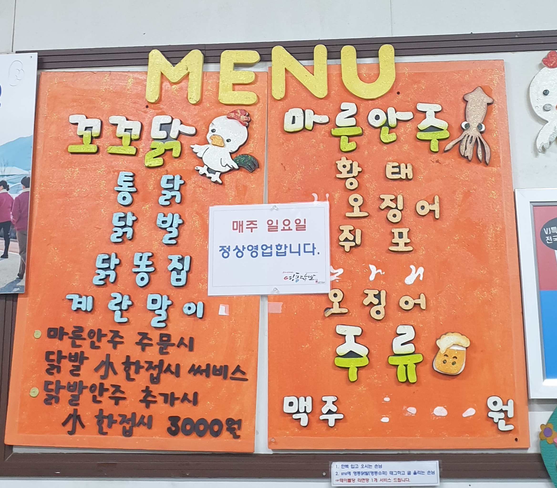 치킨류, 똥집, 닭발, 마른안주 등 가맥에 최적화된 메뉴들이 판매되고 있었어요.