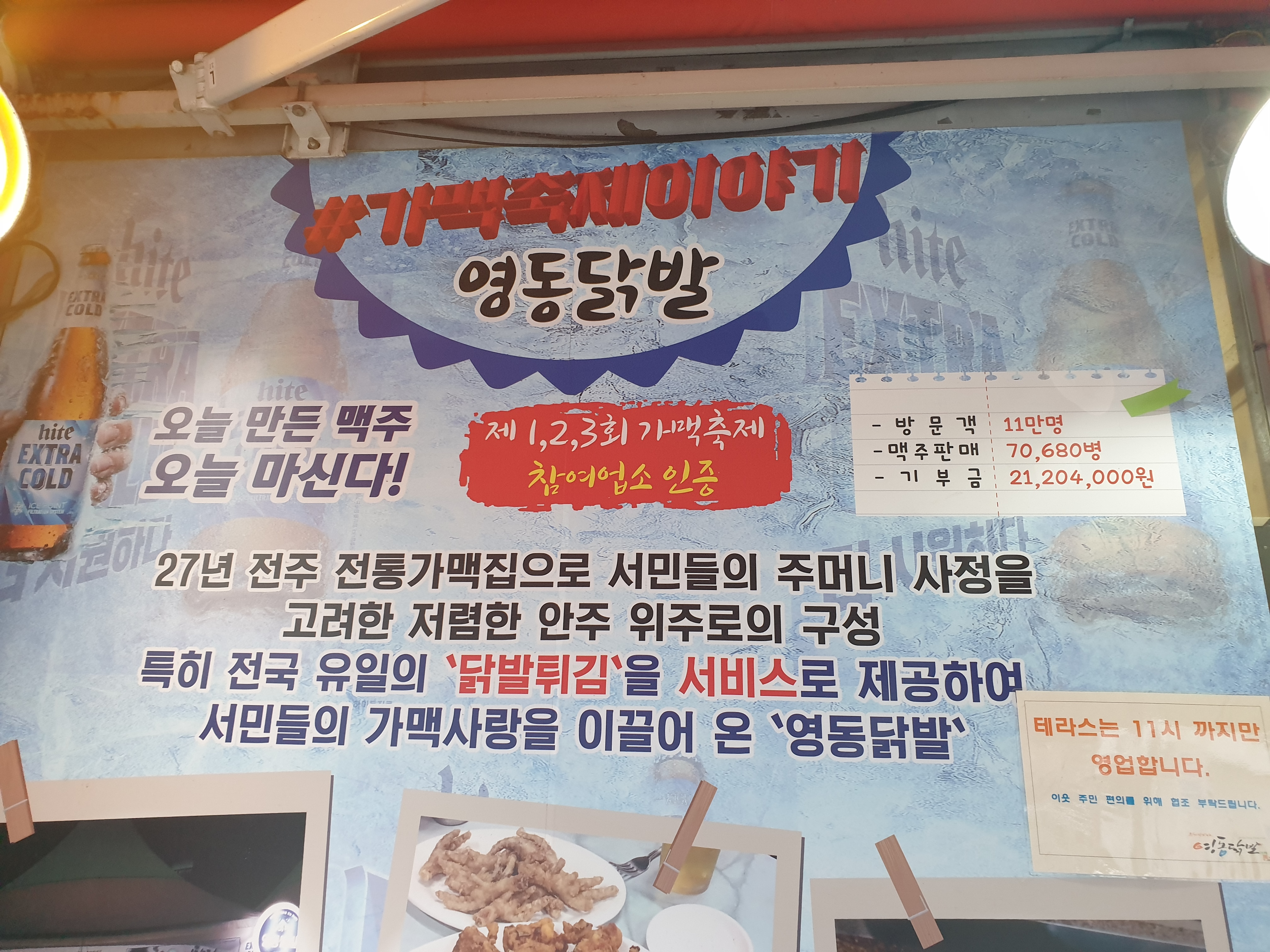 전통이 있는 가게인만큼 누적 방문객이 11만명이라고 쓰여있었고, 가맥축제에도 여러번 참여했었다는 글이 쓰여있었어요.