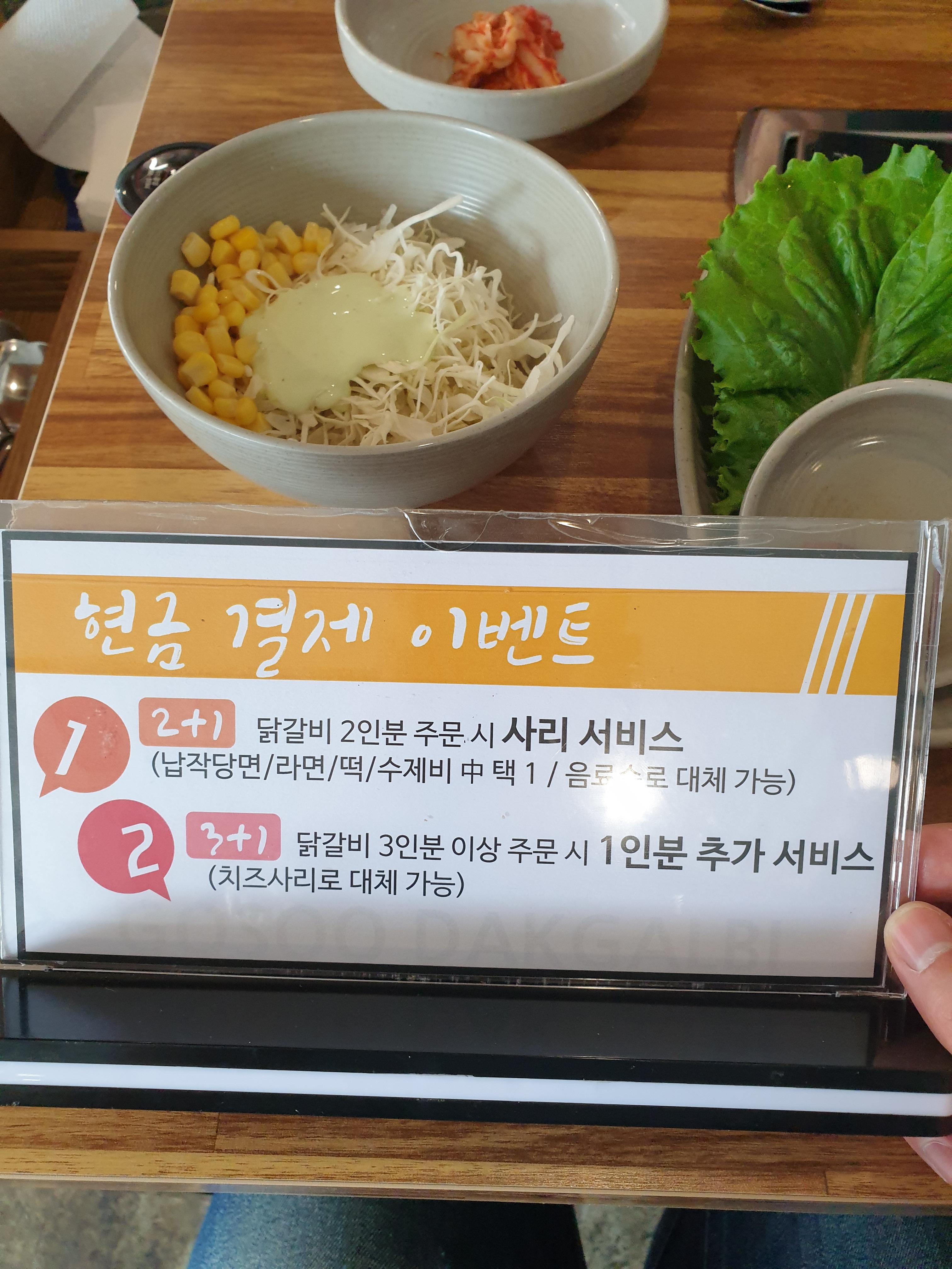 2인분을 주문할 시, 사리가 무료였고, 3인분 이상 주문시 닭갈비 1인분이 추가로 제공되는 서비스였습니다.