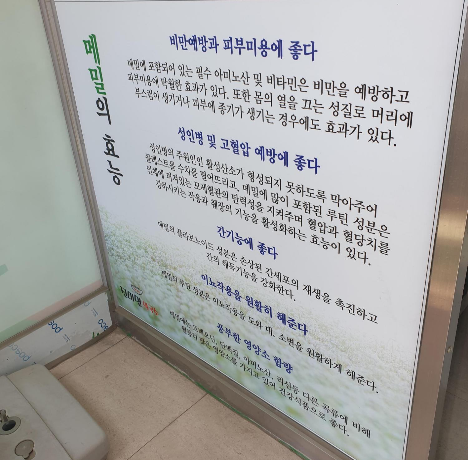 식당 입구에 들어서자 메밀에 대한 다양한 효능이 적혀 있었어요.