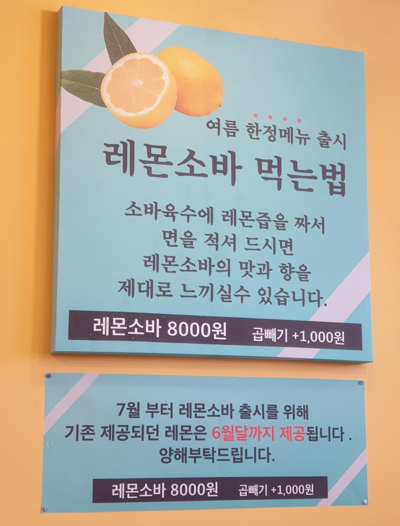 식당 안에는 여름 한정메뉴로 레몬소바가 판매되고 있음을 홍보하는 문구가 있었어요.