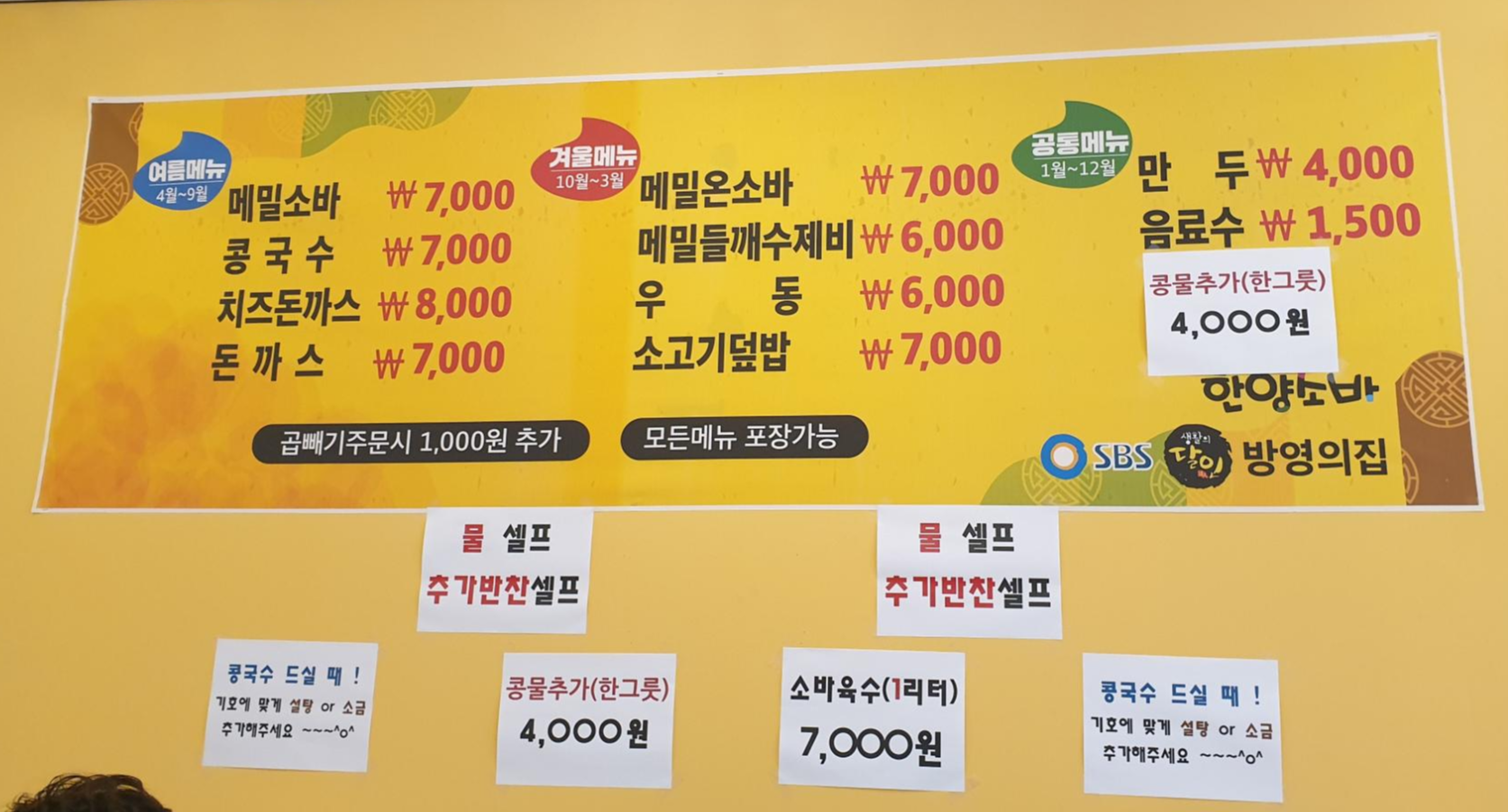 메밀소바가 7,000원, 콩국수가 7,000원으로 가격 책정이 되어있는 등 가격이 무난한 식당이었습니다.