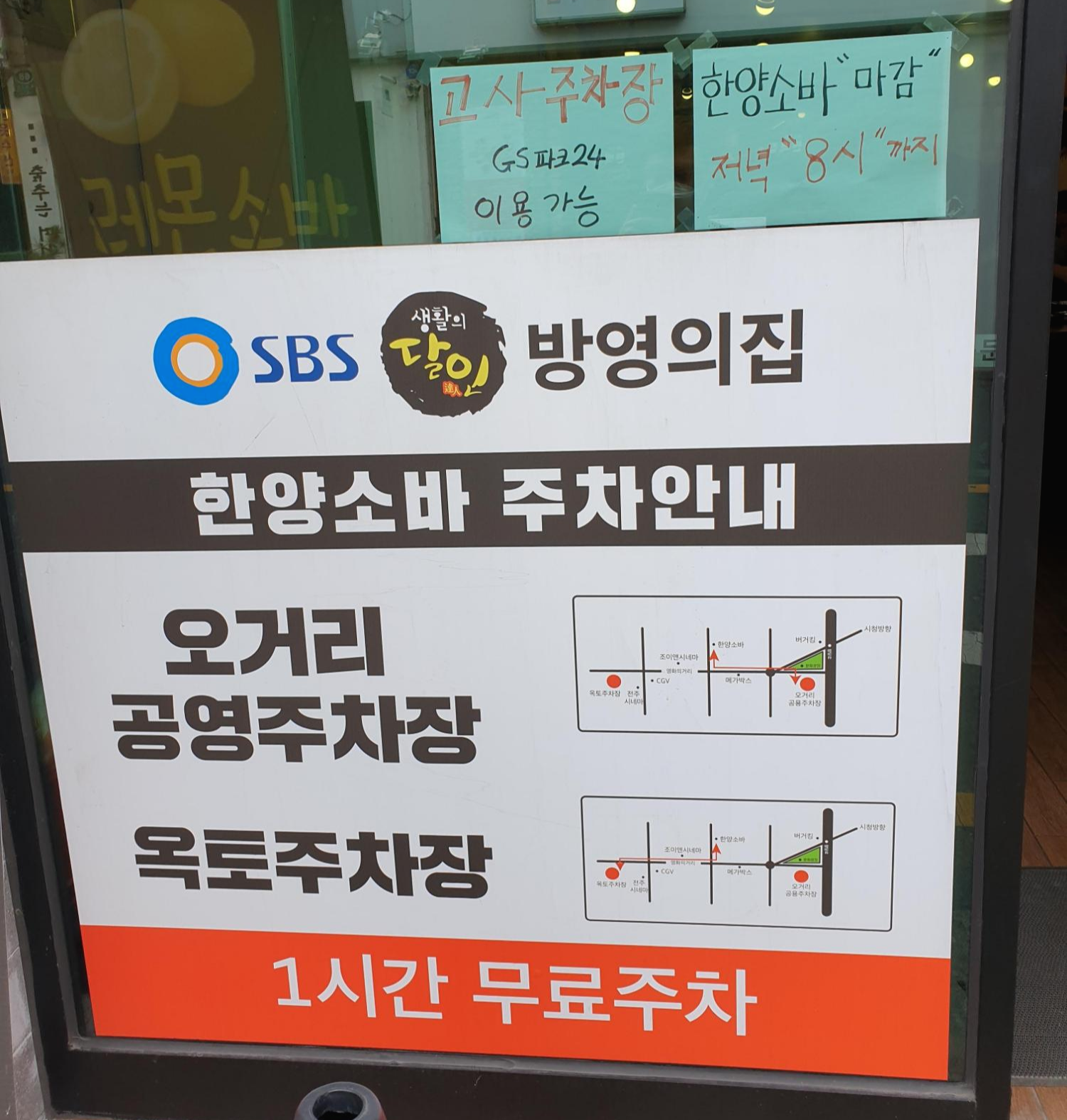 한양소바 식당 이용 시, 오거리공영주차장 및 옥토주차장에서 1시간 무료주차를 할 수 있다는 점도 이 식당의 장점이라 할 수 있겠습니다.