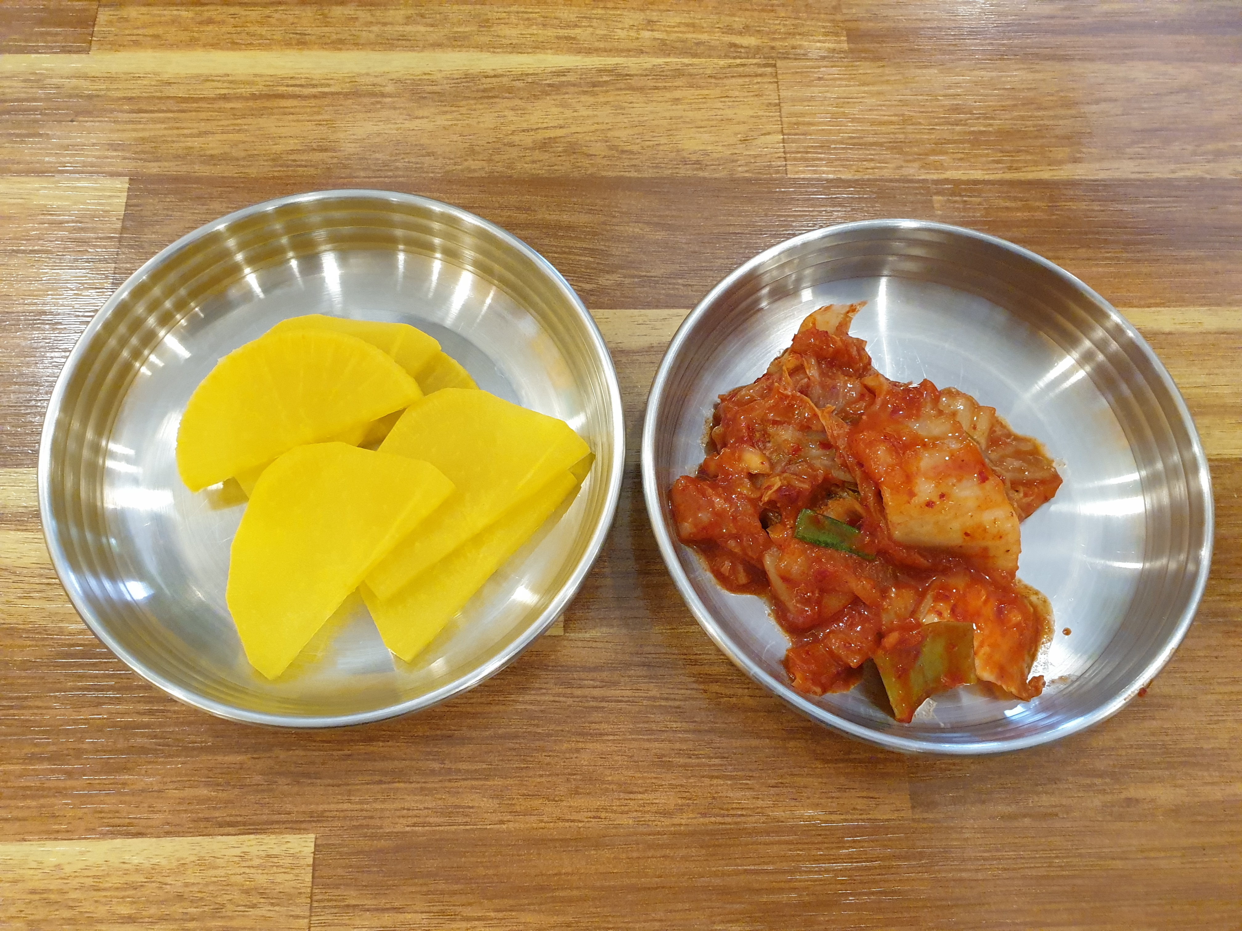 음식 주문을 마치면 기본반찬이 나오는데요. (단무지, 배추김치)