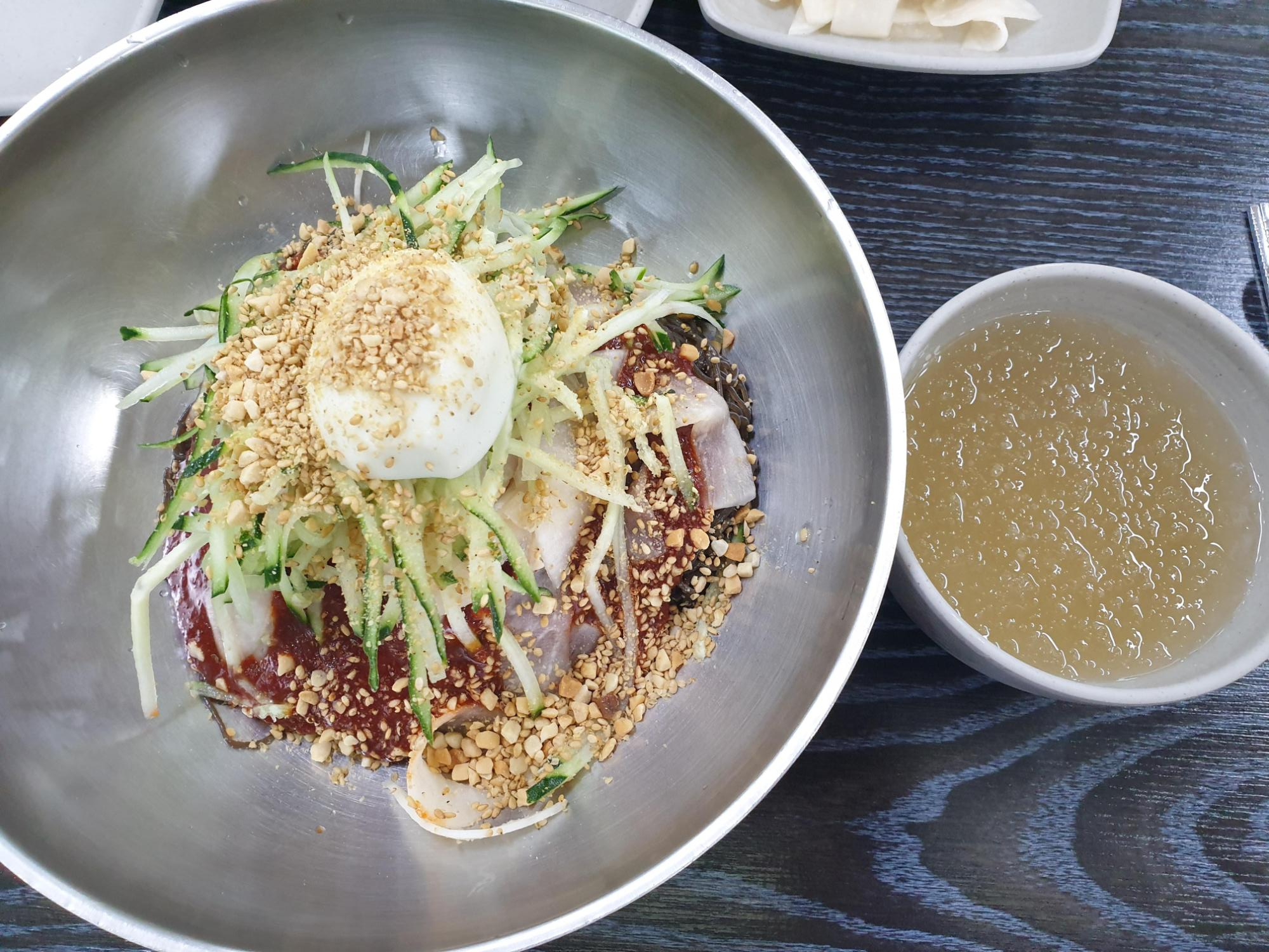 비빔냉면은 약간 매콤하기 때문에 취향에 맞게 냉면 육수를 적절하게 부어서 드시면 되겠습니다.