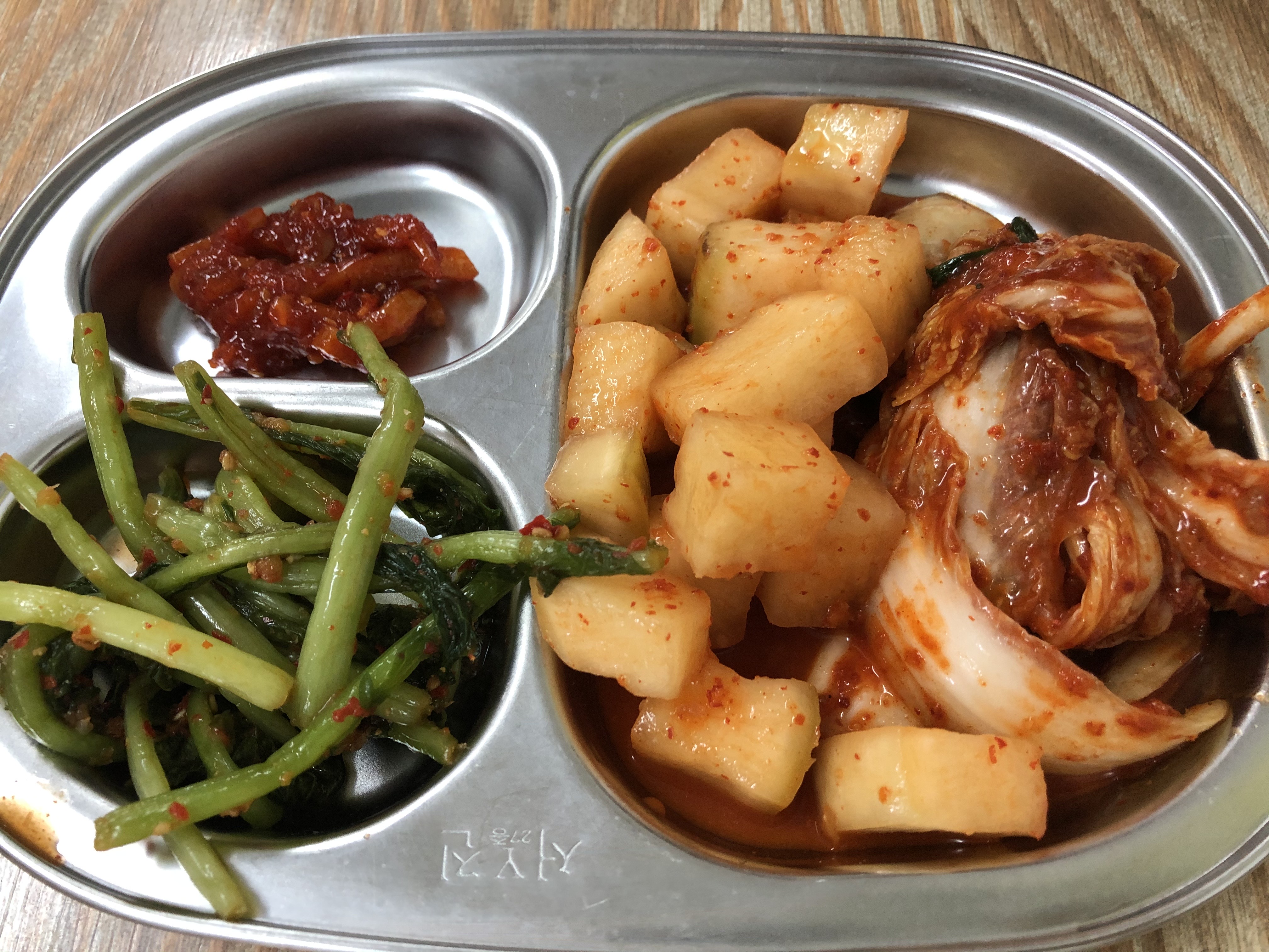 배추김치, 깍두기, 열무김치, 콩나물국, 오징어젓갈 등 다양한 반찬이 마련되어 있었습니다.