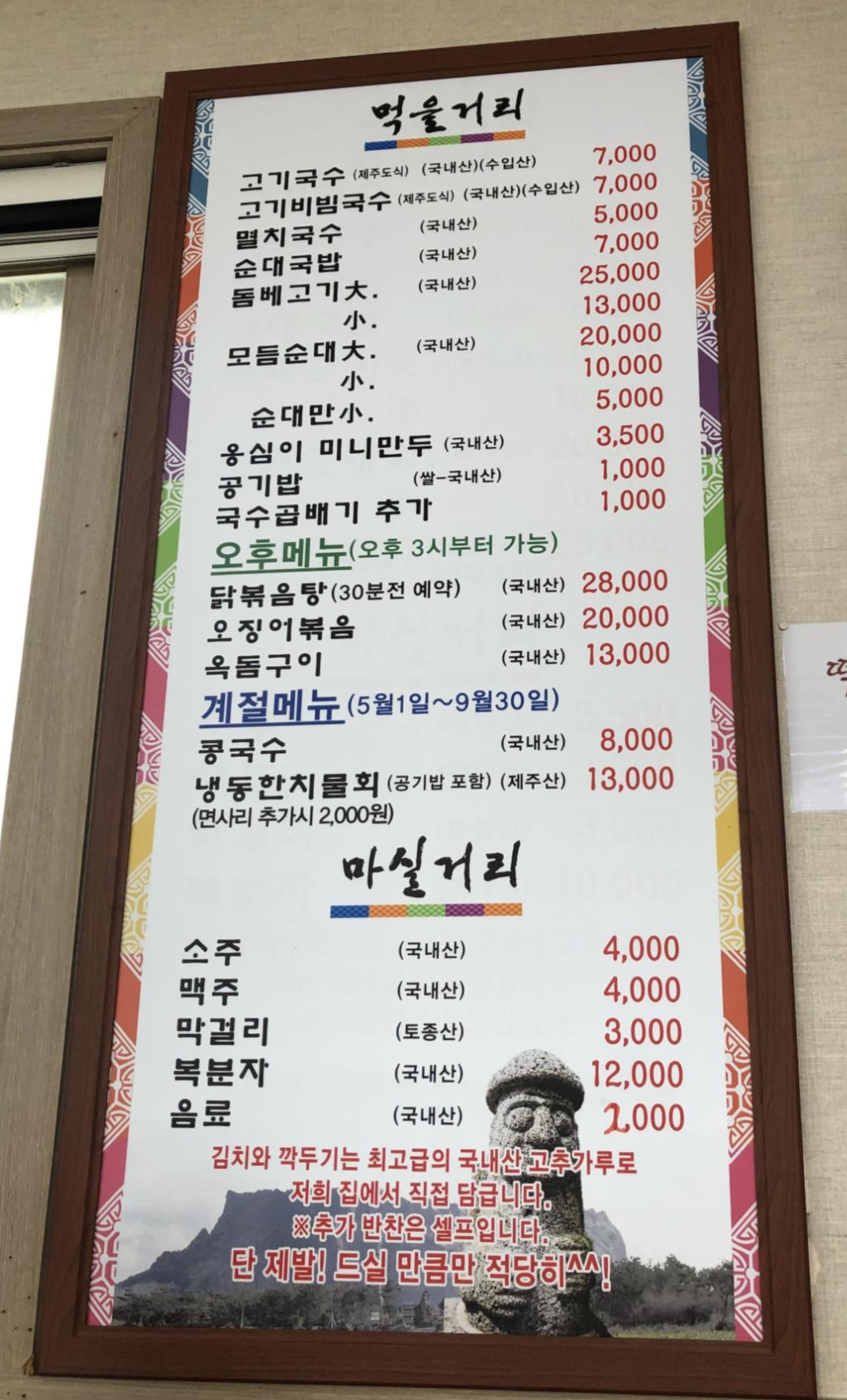이 외에 식당 외관에 표기되어 있는 것처럼 돔베고기, 순대국밥과 더불어 계절 음식으로 콩국수 및 제주산 한치물회 등을 판매하고 있는 식당입니다.