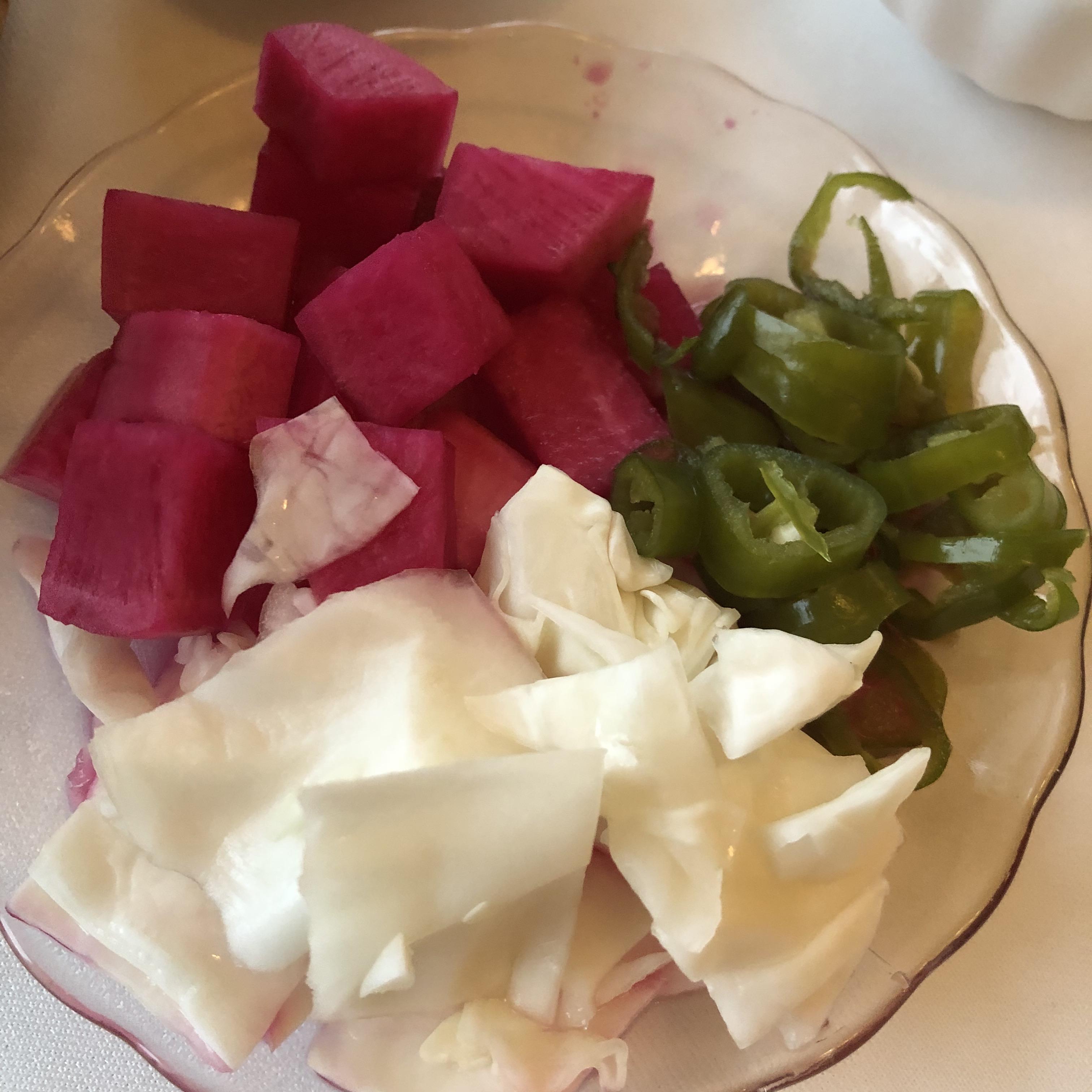 기본 반찬은 양배추, 무 피클과 고추가 나왔습니다.