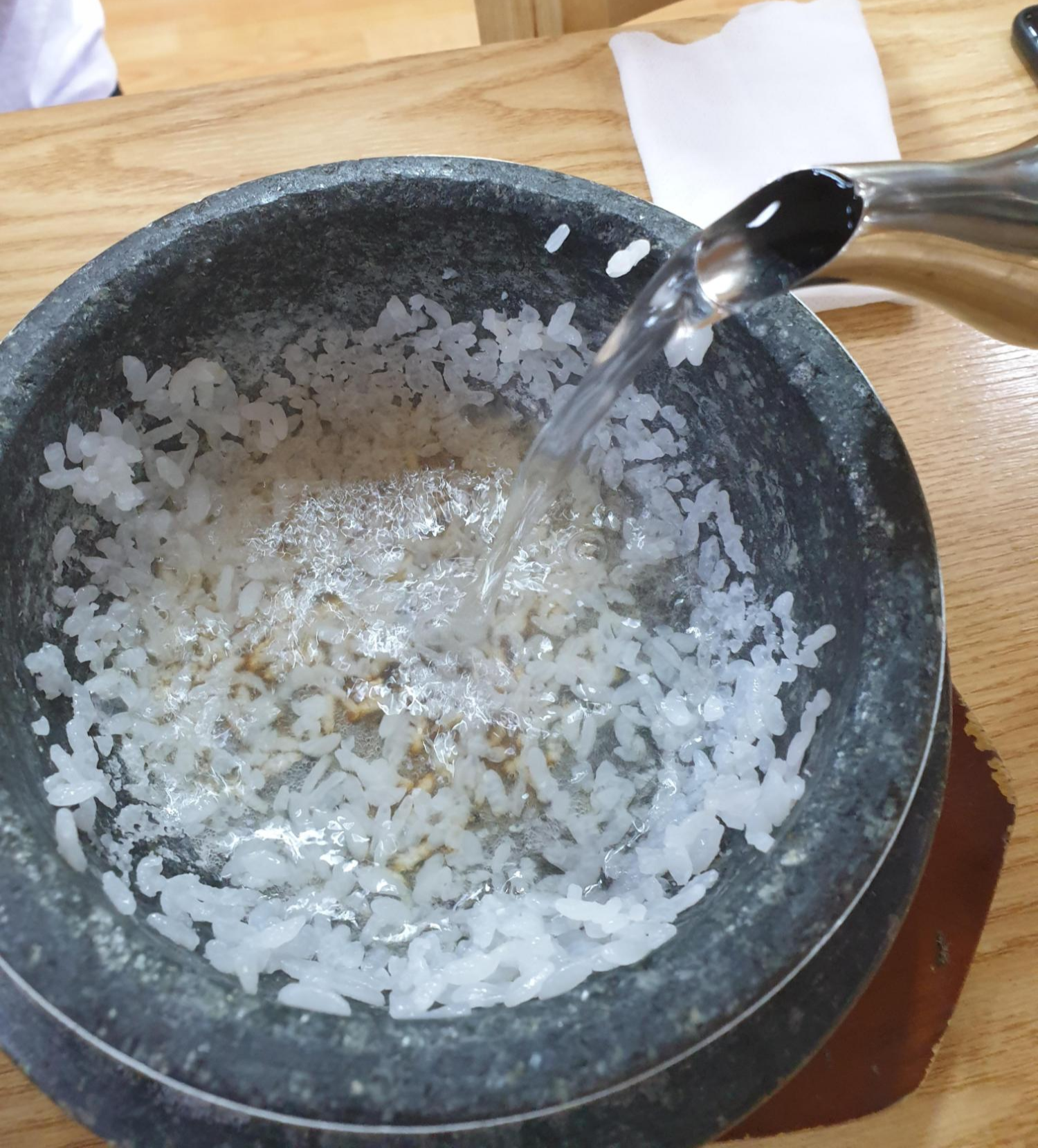 돌솥밥 뚜껑을 열고 준비된 그릇에 밥을 덜은 후, 준비된 따뜻한 물을 부어줍니다.