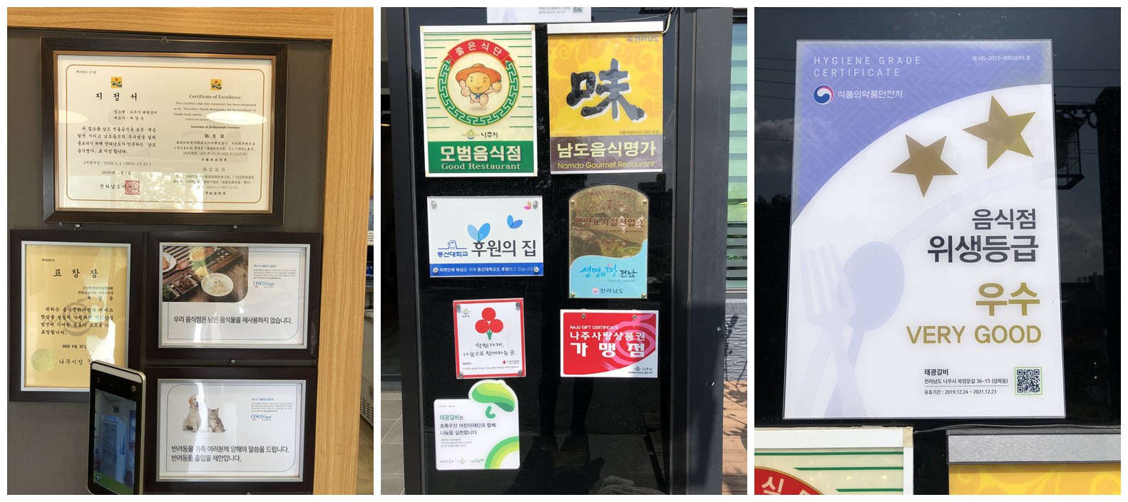 식당 입구 및 식당에 들어갔을 때 많은 현판과 표창장 등을 볼 수 있었는데요.