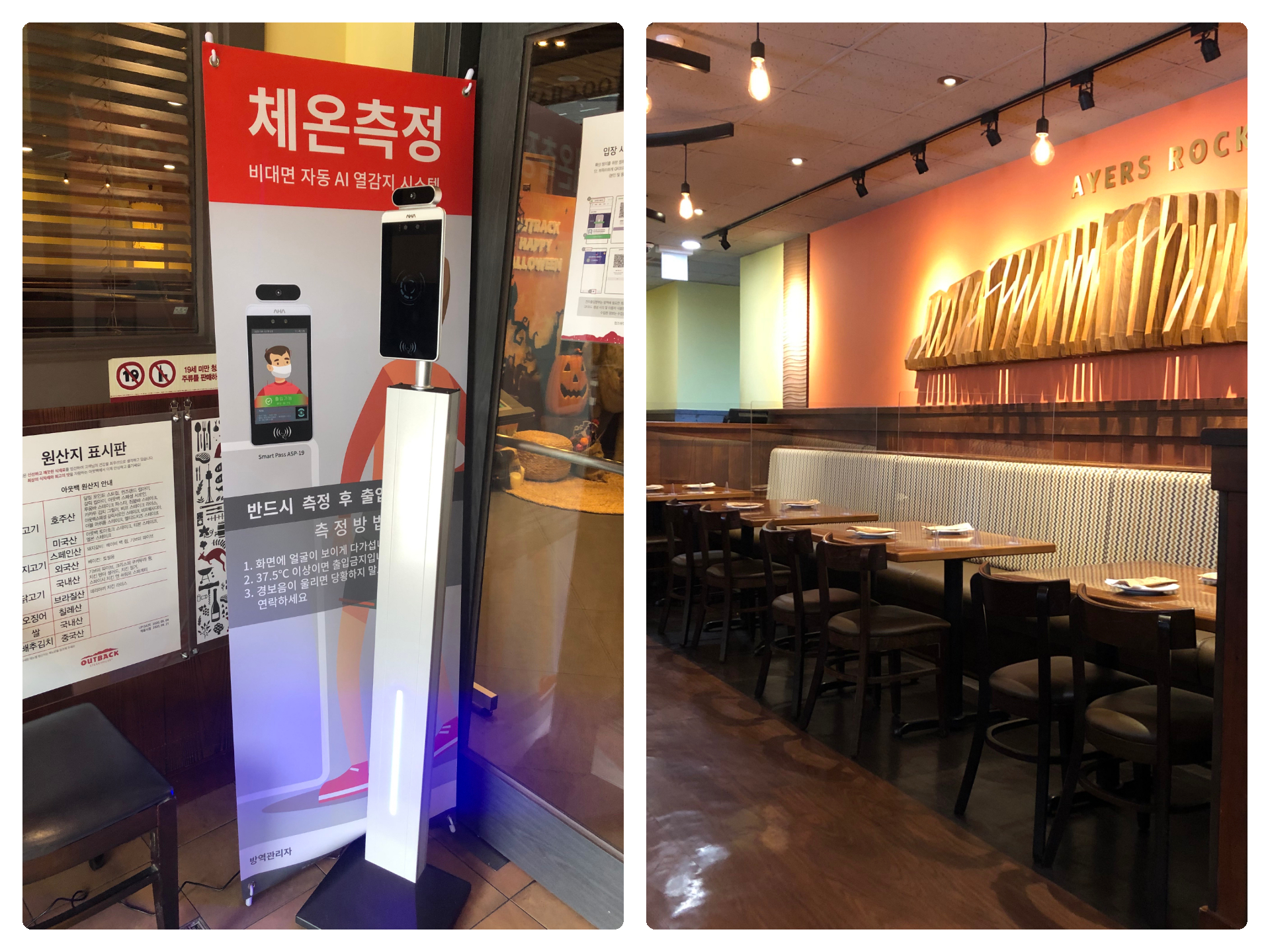 식당 내부에는 코로나 19를 대비하여 체온측정기가 마련되어 있었고, QR코드로 간편하게 인증하고 입장할 수 있었어요. 실내공간은 은은한 조명이 비추고 있어 아늑한 기분이 들었어요.