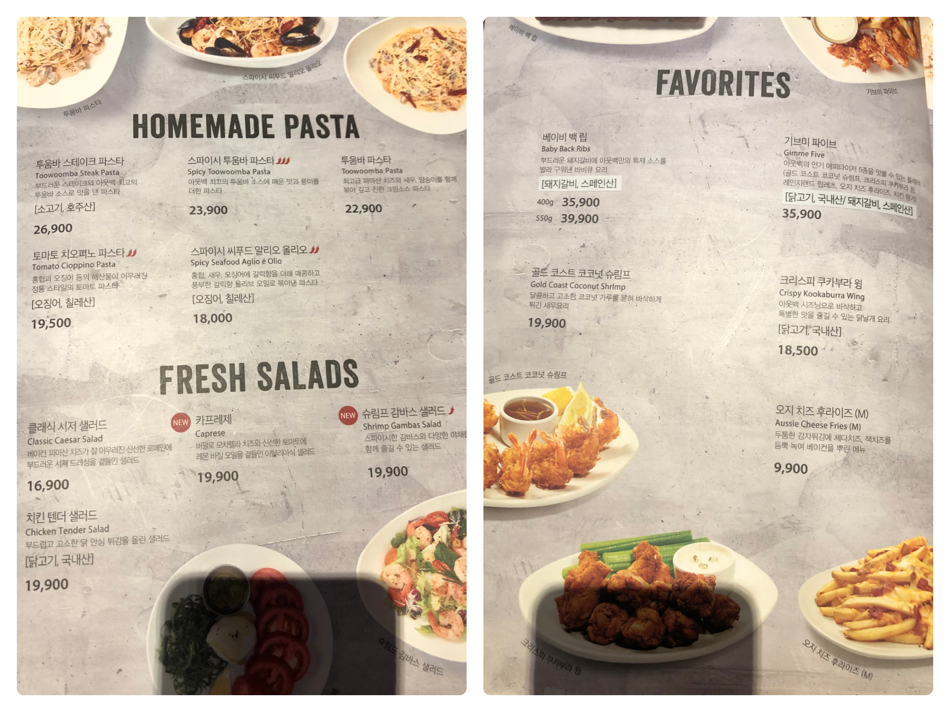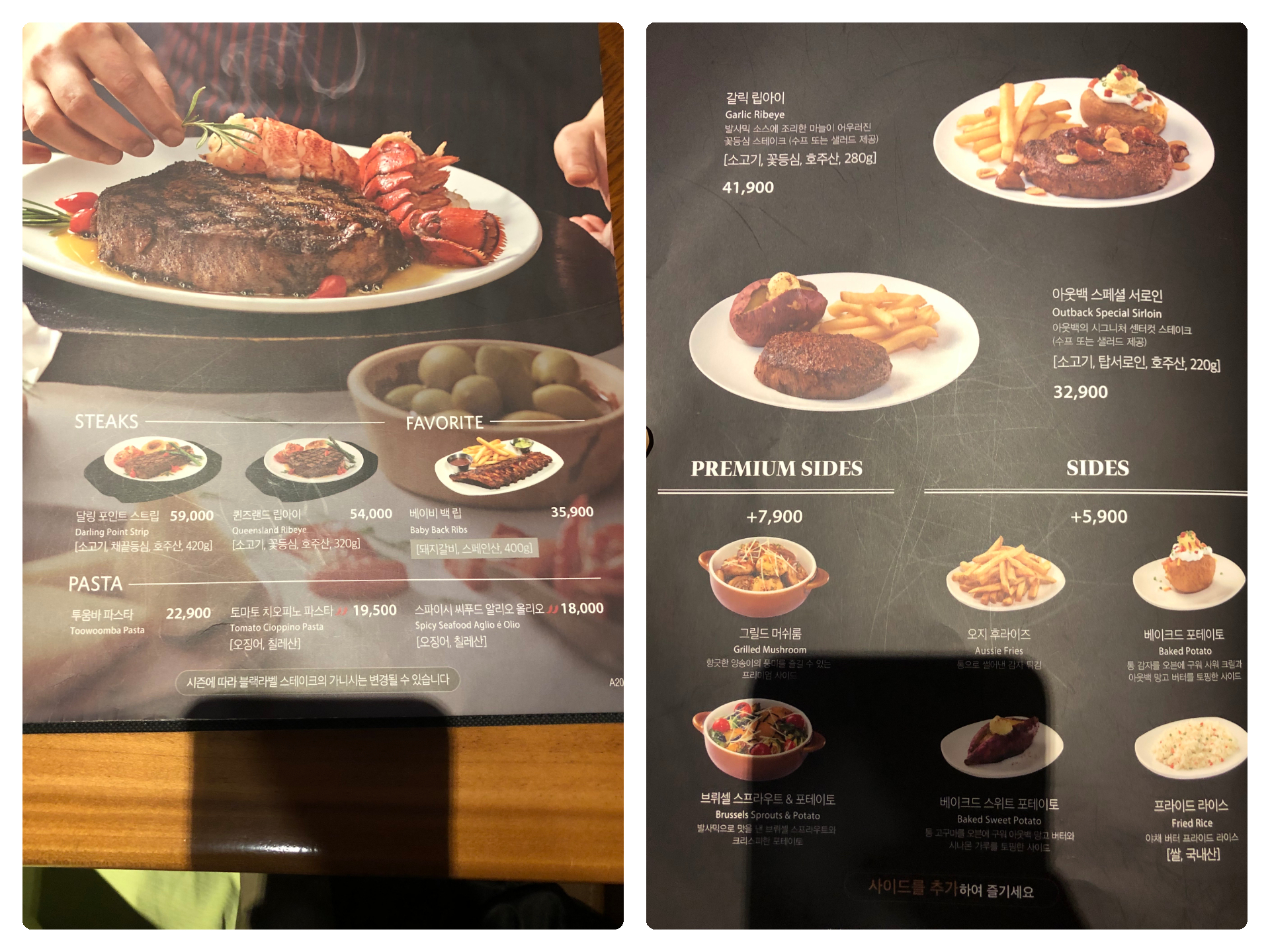아웃백 어플을 설치하거나 아웃백 공식 홈페이지에 접속하면 더 자세한 메뉴를 보실 수 있어요.