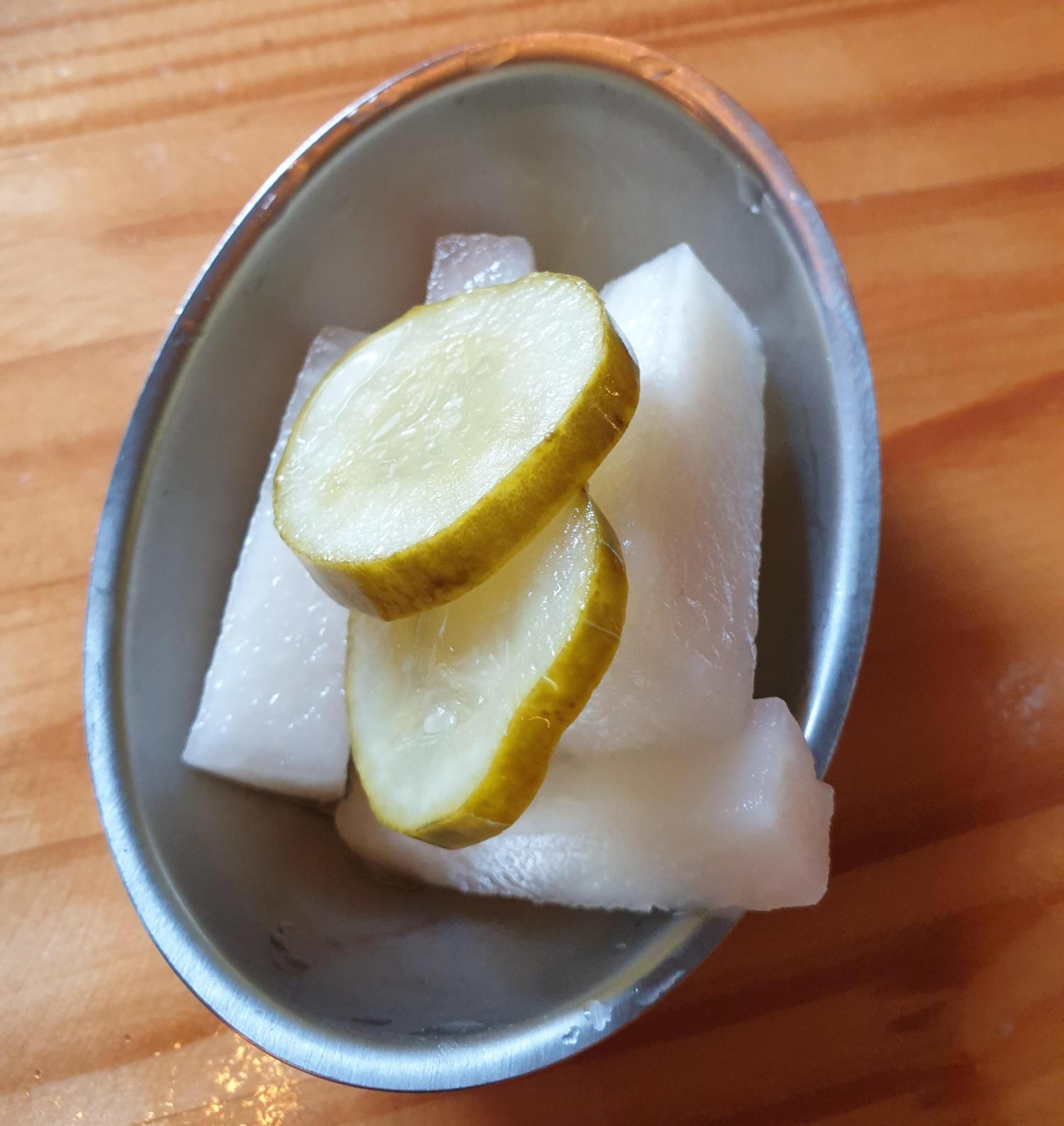 주문을 마치니 기본 반찬으로 무와 피클이 나왔습니다.