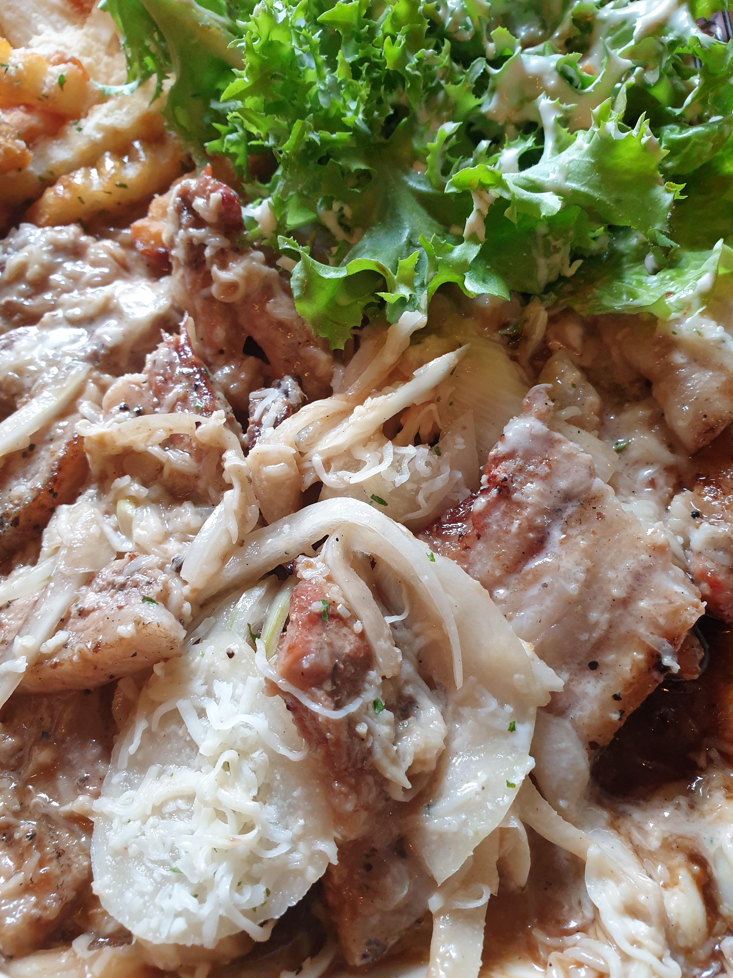 이 메뉴는 바비큐 치킨, 양파, 버섯, 크림소스로 구성된 리조또 인데요.